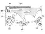 ボタン表示型のユーザ・インターフェイスでは、図9に示すように、入力用のボタンや十字キーの他入力イベントに関連する各種特定表示501乃至510が、主要な画像(人や風景の画像)の上に重畳表示される。そして、ボタンを示す特定表示501や十字キーを示す特定表示502等の限られた場所に、プレイヤーの指がタッチされた場合にのみ、入力イベントが検出される。  In the button display type user interface, as shown in FIG. 9, various
