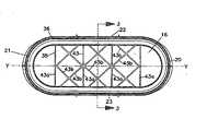 次に、図3に着目する。図3は、図2中の破断線3-3に沿って切り取られた横断面図を図示したものである。図3においてフィルタエレメント1は図1よりも短いかより狭い寸法を備える横断面となる。しかしながら、図2の破断線Y-Yであるより長い軸に沿って切り取られた横断面図も、図3と同様の特徴点を備えている。  Next, pay attention to FIG. FIG. 3 is a cross-sectional view taken along the broken line 3-3 in FIG. In FIG. 3, the