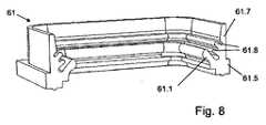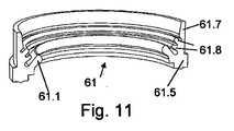 放出装置用の封止材のさらなる実施例を図7および図8に示す。この封止材は、図1の醸造モジュールの放出装置3の封止材に対応する。先に説明した封止材と同様に、この封止材61は、カプセル51を取囲む封止鍔61.7をさらに含む。封止鍔61.7に近接して鍔を有し、内向きに突出し、カプセル51の端面を圧迫する(第1の)封止口縁61.1に加えて、封止材61は、カプセルの端縁の領域においてカプセルを圧迫する、2つのさらなる封止口縁61.8を含む。特に、封止口縁61.8は、剛性溶接端51.1の両側に存在するように配置され得、これによって特に良好な安定および封止効果が得られる。  A further embodiment of a sealing material for the discharge device is shown in FIGS. This sealing material corresponds to the sealing material of the