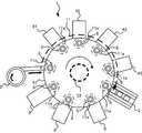 経路11はターレットテーブル51と吸着ノズル6で形成される。ターレットテーブル51は、1点を中心にして放射状に同一半径で拡がる円盤又は星形等の形状を有する。ターレットテーブル51は、架台12に載置され、所定高さで水平方向に拡がっている。ターレットテーブル51の駆動源は、ダイレクトドライブモータ52である。ダイレクトドライブモータ52は、ターレットテーブル51の底面に接続され、ターレットテーブル51を架台12表面から所定高さに支持している。このダイレクトドライブモータ52は、ターレットテーブル51を円周方向に所定角度ずつ間欠的に回転させる。  The
