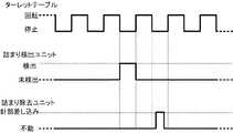 図11は、詰まり除去ユニット8の動作タイミングを示すタイミングチャートである。上流側から詰まり検出部9のカメラ91と詰まり除去ユニット8がこの順で隣り合って設置されているものとする。図11に示すように、ターレットテーブル51が停止する各時間帯において、解析部が異物63を検出していない状態では、その次の時間帯における詰まり除去ユニット8の駆動は行わない。一方、解析部が異物63を検出すると、その次の時間帯、すなわち詰まりが生じている吸着ノズル6が詰まり除去ユニット8に到達した時間帯において、詰まり除去ユニット8を駆動させて、異物63を除去する。(Function)