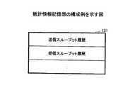 図6は、統計情報記憶部の構成例を示す図である。同図に示されるように、統計情報記憶部131は、送信スループット履歴及び受信スループット履歴等を記憶する。送信スループット履歴は、或る期間ごとの送信スループットと、当該期間の区切りの時刻との組み合わせの履歴である。本実施の形態において、当該期間は、メッセージを送信するタイミングによって区切られる。したがって、当該期間は必ずしも一定ではない。受信スループット履歴は、或る期間ごとの、受信スループットと、当該期間の区切りの時刻との組み合わせの履歴である。本実施の形態において、当該期間は、メッセージを受信するタイミングによって区切られる。したがって、当該期間は必ずしも一定ではない。なお、送信スループット履歴に関して、送信先の区別は無い。また、受信スループット履歴に関して、送信元の区別は無い。  FIG. 6 is a diagram illustrating a configuration example of the statistical information storage unit. As shown in the figure, the statistical
