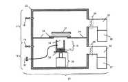 成膜装置20は真空槽22を含み、真空槽22は、成膜準備中、内部に蒸発源19が配置される蒸発室16と、蒸発室16に隣接して配置され、内部に基板21が配置される成膜室17とに区画される。蒸発室16及び成膜室17のそれぞれに、各室を真空排気するための真空ポンプ37,38が接続されている。蒸発室16及び成膜室17のそれぞれに、各室に非反応ガスを導入するための非反応ガス導入機構18が接続されている。蒸発室16の内部には、成膜材料15を保持し、開放面14を有する半密閉構造の、加熱可能な蒸発源19が配置されている。成膜室17の内部には、成膜対象物たる基板21が配置されている。蒸発源19は、移動機構35によって移動可能に配置されている。これによって、蒸発源19は、図1(b)に示すように開放面14を基板21に接近させることや、逆に図1(a)に示すように基板21から遠ざけることができる。蒸発室16と成膜室17との間にはコンダクタンス可変構造34が配置されており、これによって蒸発室16と成膜室17が区分けされている。コンダクタンス可変構造34を動かすことにより、成膜室16と蒸発室17との間の空間的連続性を完全に遮断若しくはほぼ遮断して両室の間に差圧を確保したり、又は、両室の空間を連続させて両室を同圧下に置くことができる。 The