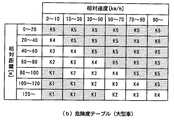 図5〜図7の説明に戻って、まず、図5の示した(a)危険度テーブル(普通車)において、上記相対速度および相対距離(15km/h、70m)をあてはめると、危険度はK2であると判定される。一方、図6に示した(b)危険度テーブル(大型車)において、上記相対速度および相対距離(15km/h、70m)をあてはめると、危険度はK3であると判定される。 Returning to the description of FIG. 5 to FIG. 7, first, when the relative speed and the relative distance (15 km / h, 70 m) are applied in the (a) risk level table (ordinary vehicle) shown in FIG. It is determined that it is K2. On the other hand, when the relative speed and the relative distance (15 km / h, 70 m) are applied in the (b) risk level table (large vehicle) shown in FIG. 6, the risk level is determined to be K3.