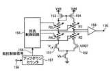 図15は、コンパレータを構成する差動増幅器の入力MOSトランジスタ(151)、(152)と負荷MOSトランジスタ(153)、(154)のドレイン間に抵抗(R1)乃至(R4)を接続し、抵抗の所定の位置の電圧の差動出力を差動増幅器(159)の出力端子(150)から得る構成を一般化した回路図である。4つの可変抵抗(R1)から(R4)の値を調整することで、差動増幅器(159)への入力電圧が調整でき、出力端子(150)から得られる出力電圧が調整できる為、コンパレータの閾値を調整することが出来る。可変抵抗(R1)乃至(R4)は、例えば、抵抗にスイッチが並列接続された複数の並列回路の直列接続で構成され、その並列接続されたスイッチを抵抗制御回路(155)からの制御信号でオン/オフさせることにより抵抗値を調整する構成とすることができる。抵抗制御回路(155)には、ローサイドスイッチ(2)のオフのタイミングを早める/遅らせる制御に応じた抵抗制御信号(156)が供給される。電流方向検知回路(8)の出力が端子(158)に供給され、それに応じて、アップダウンカウンタ(157)のデータが変更され、そのアップダウンカウンタ(157)の出力が抵抗制御信号(156)として、抵抗制御回路(155)に供給される。 In FIG. 15, resistors (R1) to (R4) are connected between the drains of the input MOS transistors (151) and (152) of the differential amplifier constituting the comparator and the load MOS transistors (153) and (154). It is the circuit diagram which generalized the structure which obtains the differential output of the voltage of a predetermined position from the output terminal (150) of a differential amplifier (159). By adjusting the values of the four variable resistors (R1) to (R4), the input voltage to the differential amplifier (159) can be adjusted and the output voltage obtained from the output terminal (150) can be adjusted. The threshold can be adjusted. The variable resistors (R1) to (R4) are configured by, for example, a series connection of a plurality of parallel circuits in which switches are connected in parallel to the resistors, and the switches connected in parallel are controlled by a control signal from the resistance control circuit (155). The resistance value can be adjusted by turning on / off. The resistance control circuit (155) is supplied with a resistance control signal (156) corresponding to control for advancing / delaying the OFF timing of the low-side switch (2). The output of the current direction detection circuit (8) is supplied to the terminal (158), and the data of the up / down counter (157) is changed accordingly, and the output of the up / down counter (157) is changed to the resistance control signal (156). Is supplied to the resistance control circuit (155).