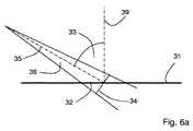 図6aは、斜めの角度33の光円錐36を用いて表面31を照明する一般的な幾何学状況を示す。斜めの角度33は、ここでは、表面31の法線39と光円錐36の光軸35とにより囲まれる角度として定められる。この角度33は、ここでは、ゼロとは異なるので、表面31の照明は、表面31の法線39に沿って生じない。光円錐36は、断面領域32で、表面31に交わる。光円錐36の光軸35に垂直な光円錐36の断面34も図示される。図6bには、断面34の上面図が示され、図6cには、断面領域32が示される。この事例で示される断面34は、円であり、直径がDである。断面領域32は、第1直径38と、第1直径38に垂直な第2直径Qとを示す。光軸35に垂直な断面34は、ここでは、光軸35が表面31に交わる点で取られている。従って、この事例では、直径Qは、直径Dに等しい。他方では、光軸35及び表面法線39により定められる平面内にある直径38は、断面34の直径Dに対して延びている。直径38及びDの相対寸法は、図示される実施例の角度33と光円錐36の発散とにより定められる。断面34の直径Dに対する断面領域32の直径38の延びが、光円錐、即ち、発散性の光束に対して起こるばかりでなく、収束性の光束及び光線が平行な光束に対しても起こることは、当業者に明らかである。光束の光軸35に垂直な光束の断面34の断面が、円とは異なり、例えば、楕円、長方形、正方形、多角形等である場合にも、その延びは、明らかに生じる。  FIG. 6 a shows a general geometric situation in which the