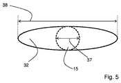 図5は、図4の断面領域32の上面図を示す。照明されるべき領域15も図示される。照明されるべき領域15の直径37は、断面領域の直径38よりも小さい。照明されるべき領域15は、断面領域32内に含まれる。断面領域32は、表面31(図4を参照すること)上への光円錐36の(図4を参照すること)入射角が斜めであるために、照明されるべき領域15と比べて、直径38に沿って延びている。従って、光円錐36の光束は、断面領域32にわたり分散されており、その領域は、照明されるべき領域15よりも大きい。従って、照明されるべき領域15内の光強度は、表面の法線39に沿って照明されるべき領域15を照明する場合と比べて低下する。一般には、この強度の低下は、望ましいものではない。  FIG. 5 shows a top view of the