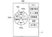 図26は、ユーザが自身の指250を使用して「コピー」と「右上スライド操作」とを対応付けようとしている様子を示す図である。図26に示されるように、ユーザが、テーブル設定画面400において「コピー」という文字列が示される領域460aに対して指250を接触させて、その後、当該指250を、「右上スライド操作」に対応する扇形領域410aまでスライドさせると、対応関係テーブル222に対して、「コピー」と「右上スライド操作」とが対応付けられて登録される。そうすると、図27に示されるように、「右上スライド操作」に対応する扇形領域410aには、「コピー」という文字列が示されるようになる。  FIG. 26 is a diagram illustrating a state in which the user uses his / her