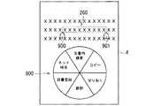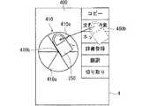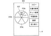 図8に示されるように、円230は、中心点230aを基準にして上下に2分割されており、上側の半円と下側の半円のそれぞれが、3つの扇形領域230bに区分されている。そして、中心点230a(選択情報の位置)から右上方向の扇形領域230bには「コピー」の文字列が示されている。これにより、右上スライド操作に対しては、選択情報をコピーする処理が対応付けられていることが理解できる。  As shown in FIG. 8, the