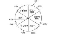 中心点230a(選択情報の位置)から真下方向の扇形領域230bには「翻訳」の文字列が示されている。これにより、真下スライド操作に対しては、選択情報を翻訳する処理が対応付けられていることが理解できる。  A character string “translation” is shown in the