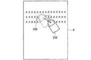 図9に示されるように、ユーザが、自身の指250によって、対象表示画面4における、選択対象の文字列が表示されている領域を右方向になぞり、その後、指250を対象表示画面4から離すと、画面操作特定部210では、当該文字列を選択する表示情報選択操作が対象表示画面4に対して行われたことが特定される。そうすると、処理実行部200では、表示制御部204が、対象表示画面4を有する表示部3を制御して、図10に示されるように、対象表示画面4において、選択情報である選択された文字列260(以後、「選択文字列260」と呼ぶ)をハイライト表示(強調表示)する。  As shown in FIG. 9, the user traces the area where the character string to be selected on the