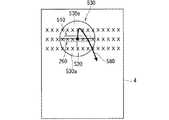 ユーザは、表示情報選択操作を行った後、実行指示操作を行うために、まず、表示画面4において選択情報(図24の例では選択文字列260)が表示されている領域310に対して画面操作手段(指あるいはペン状部材など)を接触させる。画面操作特定部210は、この画面操作手段の接触点を中心点320とした所定半径の円330を考える。そして、画面操作特定部210は、円330を中心点320を基準にして上下に2分割し、それによって得られる上側の半円と下側の半円のそれぞれを3つの扇形領域330aに区分する。画面操作特定部210は、表示画面4での画面操作手段の接触点が中心点320から移動すると、その接触点が移動する扇形領域330aを特定することによって、当該画面操作手段のスライド方向、つまり、実行指示操作として、どの方向へのスライド操作が行われているかを特定する。例えば、画面操作特定部210は、表示画面4での画面操作手段の接触点が、中心点320の右上の扇形領域330aを移動している場合には、実行指示操作として、選択情報から右上方向に向かうスライド操作(右上スライド操作)が行われていると判定する。そして、画面操作特定部210は、図24の矢印350に示されるように、表示画面4での画面操作手段の接触点が扇形領域330aを通って円330の外側まで移動すると、表示画面4に対して実行指示操作が行われた(完了した)と判定する。このとき、画面操作特定部210は、表示画面4での画面操作手段の接触点が円330の外側まで移動して、当該画面操作手段が当該表示画面4から離れたときに、当該表示画面4に対して実行指示操作が行われたと判定しても良い。つまり、画面操作手段が表示画面4から離れるまでをスライド操作に含めても良い。処理実行部200では、画面操作特定部210において特定された実行指示操作に応じた表示情報利用処理が行われる。  In order to perform the execution instruction operation after the display information selection operation is performed, the user first displays the screen on the