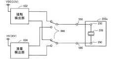 100…インクカートリッジ、190…絶縁基材、200,200a…基板(回路基板)、201…ボス溝、202…ボス穴、203…記憶装置、204…抵抗素子、208…センサー(容量素子)、210〜290…基板端子、210cp〜290cp…接触部、300…連結基板部、301〜304…小基板部、310,320…予備端子、400…主制御回路、410…CPU、420…メモリー、430…表示パネル、500a…サブ制御回路、501…メモリー制御回路、502…カートリッジ検出回路、503…センサー関連処理回路、510〜590…装置側端子(電気接触部材)、610…検出電圧制御部、620…過電圧検出部、630,630b…個別装着検出部、631〜634…抵抗素子、641〜645…ダイオード、650…検知パルス発生部、651…入力配線、660…センサー処理部、662…接触検出部、664…液量検出部、666…切換スイッチ、670…非装着状態検出部、672…リーク判定部、674…電圧障壁部、675…電流検出部、676…AD変換部、677…波形分析部、701〜704…装着検出用抵抗(直列接続抵抗)、710…電流―電圧変換部、712…オペアンプ、720…電圧比較部、722…電圧生成部、723…切換スイッチ、724…コンパレーター、726…切換制御部、730…比較結果記憶部、732…切換スイッチ、734…ビットレジスター、740…電圧補正部、742…オペアンプ、750…入力切換スイッチ、751〜754…入力端子、1000…印刷装置、1100…カートリッジ装着部、1110,1120…ピン、1112,1122…付勢バネ、1111,1121…貫通孔、1130…固定部材、1140…凹凸嵌合部、1141…貫通孔、1150…スライダー部材、1160…奥壁部材、1180…インク供給管、1181…貫通孔、1200…カバー、1300…操作部、1400…接点機構。  DESCRIPTION OF
