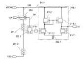 と容量素子の一方の端子とが電気的に接続する半導体装置である。In another embodiment of the structure of the invention disclosed in this specification, a power supply line in which a first resistance element and a second resistance element are provided in series, a selection line, a selection line, and a gate terminal are electrically connected. A first resistive element, a second resistive element, and a switch transistor having a potential dividing circuit provided with a switch transistor including an oxide semiconductor layer to be connected, and a capacitor element electrically connected to the power supply line via the switch transistor The source terminal is electrically connected, and the drain terminal of the switch transistor and one terminal of the capacitor are electrically connected.