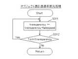 オブジェクトの属性が「1」の場合は、オブジェクトを背景に重畳表示しつつ、背景を視認しやすくするために、制御部11(表示制御部11e)は、そのオブジェクトの透過率を変更する(透過率を大きくして透明度を高くする)処理を実施する(S204)。その際、オブジェクトの透過率を目標とする透過率に一気に変化させてもよいが、透過率を一気に変化させると、ユーザの注意を惹いてしまう恐れがある。そこで、本実施例では、図9のフローチャート図に示すように、オブジェクトの透過率を徐々に大きくする制御を行う。具体的には、制御部11(表示制御部11e)は、オブジェクトの透過率(transparency)が予め定めた透過率(Tmax、例えば80%)以上になるまで、オブジェクトの透過率(transparency)に予め定めた値(fadespeed、例えば5%)を徐々に加算する(S211、S212)。 When the attribute of the object is “1”, the control unit 11 (display control unit 11e) changes the transmittance of the object (transparent) in order to make the background easy to see while superimposing the object on the background. A process of increasing the rate and increasing the transparency is performed (S204). At this time, the transmittance of the object may be changed at a stroke to the target transmittance, but if the transmittance is changed at a stroke, there is a possibility that the user's attention may be attracted. Therefore, in this embodiment, as shown in the flowchart of FIG. 9, control for gradually increasing the transmittance of the object is performed. Specifically, the control unit 11 (display control unit 11e) sets the object transparency (transparency) in advance until the object transparency (transparency) is equal to or higher than a predetermined transparency (Tmax, for example, 80%). A predetermined value (fadespeed, for example, 5%) is gradually added (S211, S212).