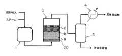 なお、本発明のようなシフト反応を行うことなく、冶金炉発生排ガス(g0)に水蒸気、水素、炭酸ガスをそれぞれ添加すれば、本発明のシフト反応で得られる有機物質改質用の混合ガス(g)と同等の組成のガスを得ることはできるが、このような方法では、水蒸気に加えて、高価な水素ガスと炭酸ガスを添加しなければならず、コスト高となる。The shift reaction in the method of the present invention may be carried out by a known method and is not particularly limited. Generally, water vapor is added to the metallurgical furnace-generated exhaust gas (g0 ) in advance, and this is introduced into a fixed bed reactor filled with a catalyst to perform a shift reaction. Alternatively, the water vapor to be added in advance may be partially used, the catalyst may be packed in multiple stages in the reactor, and the remaining water vapor may be added between the catalyst layer and the catalyst layer.
