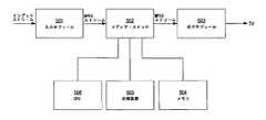MPEG-2トランスポート多重送信方式は、同じ放送チャネルの多重プログラムをサポートする(多重ビデオ、オーディオ・フィード、および、プライベート・データ)。入力モジュール501は、チャネルを特定のプログラムにチューニングして、指定されたMPEGストリームをチャネルから抽出して、残りのシステムにMPEGストリームを供給する。アナログTV信号は、システムの残りがどのように信号を入手したか気がつかないように別々のビデオおよびオーディオのエンコーダを使用して、類似したMPEG形式に符号化される。情報は、多数の標準規格方法でアナログTV信号の垂直帰線消去区間(VBI)に調整することができる。例えば、北アメリカ放送テレテキスト標準規格(NABTS)は、FCCが、字幕(CC)および拡張データ・サービス(EDS)に一定の他のラインの使用を命じて、NTSC信号の一定のライン上へ情報を調整するために使用されてもよい。かかる信号は、入力モジュール501によって復号化される、あたかも信号がMPEG-2プライベート・データ・チャネルを介して配信されたかのように、他のモジュールが渡される。The MPEG-2 transport multiplex transmission scheme supports multiple programs on the same broadcast channel (multiplex video, audio feed, and private data). The
