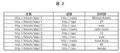 次にステップ409に進み、元のRDFデータからsを主語、pを述語を含むトリプル(s,p,o)を取り出し、縮約基準表に基づいて目的語oの縮約値を求める(coとする)。次にステップ410に進み、co(目的語oの縮約値)をvs(リソースsの縮約値のリスト)に追加し、p(未処理基準述語)を処理済みリスト(done 2)に追加した後、ステップ407に戻る。 Next, proceeding to step 409, a triple (s, p, o) including s as the subject and p as a predicate is extracted from the original RDF data, and a reduced value of the object o is obtained based on the reduced criterion table (co And). Next, proceed to step 410, add co (contracted value of object o) to vs (list of reduced values of resource s), and add p (unprocessed reference predicate) to the processed list (done 2) After that, the process returns to step 407.