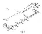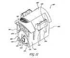 図12〜21に示されるように、例示されたカートリッジ104は、一般に近位壁400および遠位壁402を備える。第1の側壁404および第2の側壁406は、全体的に近位壁400と遠位壁402との間に延びる。また例示されたカートリッジは、美的理由のために、弁装填具106の外部筐体202に合わせて形状および構成が相関しうる(例えば、嵌合形状)上部壁408を備える。「壁」という用語は、任意の単一の表面または部材を意味するように狭義に理解されるべきではなく、むしろ広義に理解されるべきであり、壁とは、単一の平面内にあるのではなく、互いに協働して全体的な境界を形成する多表面から成りうる。したがって、例示されたカートリッジ104は、丸味を帯びた上部壁を有する概長方形の箱形状を備える。他の構成および形状、例えば、円形、円筒正方形、三角形、円錐形、台形、楕円形、またはこれらの組合せも可能である。  As shown in FIGS. 12-21, the illustrated