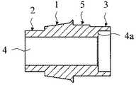 5は埋入部3の外周面上には、セラミックス製の切削ブロックBの埋入孔Ba内に埋入された際に埋入孔Baに形成されている凹状溝の底部Bbに頂部5aがそれぞれ当接して埋入孔Baの内面Bcと埋入部3の外周面3aとの間に略全周に亘って均一な歯科接着剤A用の間隙を形成させるための、歯肉当接部1側の端部からそれぞれ始まり、その長手方向が埋入部3の中心軸と平行な同形の突起条部である。