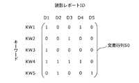 図5に文書行列の一例を示す。図5に示すとおり、文書行列50は検索可能な読影レポートID22とそれらのコンテンツから抽出されたキーワードの行列で表現される。文書行列50を構成する値は、例えばTF・IDF値または出現頻度を用いればよい。TF・IDF値とは文書に対するキーワードの網羅性および特定性を組み合わせたキーワードの重み付けの指標であり、文書中に出現したキーワードがどのくらい特徴的であるのかを識別するための指標である。TF・IDF値の具体的な算出方法については、例えば非特許文献3:「情報検索と言語処理」(pp.32−33,東京大学出版会,1999)に記載されている。例えば、読影レポートIDがD1の読影情報21においては、キーワードKW1、KW2、KW3、KW4およびKW5のTF・IDF値が、それぞれ1、0、1、1および0であることが示されている。 FIG. 5 shows an example of a document matrix. As shown in FIG. 5, the document matrix 50 is expressed by a searchable interpretation report ID 22 and a matrix of keywords extracted from their contents. For example, a TF / IDF value or an appearance frequency may be used as the value constituting the document matrix 50. The TF / IDF value is a keyword weighting index that combines the completeness and specificity of keywords with respect to a document, and is an index for identifying how characteristic a keyword that appears in a document is. A specific method for calculating the TF / IDF value is described in, for example, Non-Patent Document 3: “Information Retrieval and Language Processing” (pp. 32-33, University of Tokyo Press, 1999). For example, in the interpretation information 21 with the interpretation report ID D1, the TF / IDF values of the keywords KW1, KW2, KW3, KW4, and KW5 are 1, 0, 1, 1, and 0, respectively.
