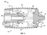代表的実施形態では、伸長部50は、本体部分12の中央開口42内に受容されるように寸法を決定されている。図11〜12から理解されるように、第1のエンドプレートの下部面48は、代表的実施形態では、少なくとも1つの傾斜面54を更に含む。別の代表的実施形態では、2つの間隔を置いた傾斜面54,56がある。傾斜面54,56の勾配は、互いに同一であっても異なっていてもよいと考えられる。傾斜面54,56の勾配に変化をつけることの効果は、以下に説明される。  In the exemplary embodiment,