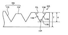 本実施形態において、凹部113の頂点11Pの高さ及び平坦部114の高さのうち一方又は両方が不揃いになっていることにより、隣り合う凹凸の高低差Hが不揃いとなっていればよい。ここでは、図2及び図4に示すように、凹部113の頂点11Pの高さは一定に揃っているが、平坦部114の高さが不揃いになっていることにより、隣り合う凹凸の高低差Hが不揃いとなっているものとして説明する。なお、前記のように平坦部114の高さが不揃いになっている場合には平坦部114には段差が存在するが、前記の不揃いの程度が小さいので前記の段差も小さい。そこで、図1及び図3では、平坦部114において前記の段差は図示を省略する。  In the present embodiment, it is only necessary that one or both of the height of the apex 11 </ b> P of the