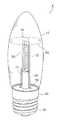 なお、LED22の個数及び配列は、電球形ランプの用途に応じて適宜、変更されればよい。例えば、豆電球やなつめ球の代替用途においては、基板21上に実装されるLED22は1個であってもよい。また、複数個のLED22は、1列で実装してもよく、あるいは、2列以外の複数列で実装しても構わない。  Note that the number and arrangement of the