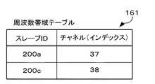 また、周波数帯域決定部154は、第1通信確立部152によって接続を確立したスレーブ200と、決定したチャネルとを、図4に示す周波数帯域テーブル161に記録する。従って、周波数帯域テーブル161には、過去にマスター100と接続を確立したことがあるスレーブ200と、周波数帯域決定部154により決定されたチャネルとが、対応付けて格納される。  Further, the frequency