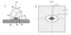 次に、本発明の第3の実施形態に係る発光装置及びそれを用いた照明装置について、図7及び図8を参照して説明する。本実施形態の発光装置1は、波長変換部材4の縦断面形状は、図7(a)に示すように、上記第1の実施形態と同様であるが、図7(b)に示すように、上面視において楕円形状となるように形成されているものである。  Next, a light-emitting device according to a third embodiment of the present invention and a lighting device using the same will be described with reference to FIGS. In the