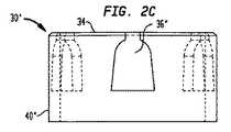 図1Aおよび図2Bに示されている受入れ部36と比較して、図2Cに示されている各受入れ部36’’は、保持縁34に近づくにつれて狭くなっている。具体的には、保持縁34から最も遠く離れている受入れ部36’の端は、保持縁34により近い受入れ部36’’の部分よりも広くなっている。図2Cに示されている受入れ部36’’のテーパ形状によって、ユーザは、図1Aおよび図2Bに示されている受入れ部36の形状と比較して、ステントの保持部材をリテーナ30’’内により容易に装填することができる。テーパ形状を有する受入れ部36’’は、本明細書に開示されているリテーナ実施形態のいずれに用いられてもよい。  Compared to the receiving