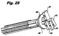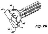 図24に示すように、使用時、器具ガイドの遠位端304は、トロカール100のボア内に導入される。所望により、バッフル160を含むサブアセンブリを取り除くことができる。しかしながら、トロカール100は、図24では、こうしたサブアセンブリを取り除くことなく図示されている。代りに、可撓性材料からなるバッフル160は、邪魔にならないところに引き伸ばされている。そのように挿入されると、器具ガイド300は、器具を支持しているロボット手術アームに対する固定入口点を提供する。各溝306の角度付き壁308は、各溝306に近づいて、その中に入る各ロボット・アームを誘導し、かつそれとの位置合せを容易にするようにより広い開口部を提供する。このように、ロボット・アームがある角度で導入される場合、溝306の壁308は、アームをトロカールのボア106内に誘導する。器具ガイド400の第2実施形態を図25〜図27に示す。器具ガイド400は、主に、トランペット状近位部を含まないが、代りに近位周方向フランジ402を含むということに関して、器具ガイド300とは異なっている。実際の外科手術用器具の代りに、複数の挿入物410が図示されている。こうした挿入物の1つを、図28に詳細に示す。本明細書で参照したすべての特許および特許出願は、あらゆる目的に対してその全体が参照により組み込まれる。  In use, the