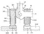 基体2の後側には、一対の板状の軸受け22、23が上方に向かって突出形成されており、各軸受け22、23には、その厚さ方向に貫通する貫通孔221、231が形成されている。また、一対の軸受け22、23は、基体2の前後方向に沿って対向して配置されている。したがって、各貫通孔221、231および後述する押圧体5の中心部50にわたって軸9が挿入されることにより、押圧体5が基体2に対して図3中の左右方向に回動可能になっている。  A pair of plate-