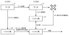 なお、送信停止メッセージを受信した時点で、送信元ノードの公開鍵を受信できていない場合も想定される。この場合は、復号処理が必要であることが判別可能なように、受信した送信停止メッセージを送信停止メッセージ記憶部407に格納すればよい。そして、新しいノードからの公開鍵を受信する度に、復号処理が必要な送信停止メッセージをこのノードから受信済みであるか判断し、該当する場合には送信停止メッセージに含まれる暗号化ハッシュ値の算出および対応するデータの送信停止処理等を行うようにすればよい。  Note that it may be assumed that the public key of the transmission source node has not been received when the transmission stop message is received. In this case, the received transmission stop message may be stored in the transmission stop