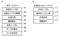 次に、送信停止メッセージ生成部410が行う送信停止メッセージ生成処理について図8(a)のフローチャートを参照して説明する。送信停止メッセージ生成部410は、送信を停止したい一般データのハッシュ値を算出する(S801)。ここで、送信停止対象の一般データは、自ノードが送信元のデータであるため、送信停止メッセージ生成部410は自ノードが生成・送信した一般データ(もしくはそのハッシュ値)を記憶しておく必要がある。送信停止メッセージ生成部410は、暗号処理部413に依頼して算出したハッシュ値を自ノードの秘密鍵で暗号化し、暗号化ハッシュ値を取得する(S802)。そして、この暗号化ハッシュ値を含む送信停止メッセージパケットを生成する(S803)。送信停止メッセージ生成部410は、生成した送信停止メッセージを適切な優先度クラスを有する送信キューに格納する(S804)。[Transmission stop message generation processing]