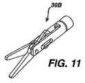 この実施形態でのローダーシャフト(12)は、剛性かつ直線状であるが、シャフト(12)は、湾曲状又は可撓性とすることが可能であり、このことは、遠位端(13)の、手術野への自然開口部経管腔導入に関して有益である。ローダー(10)は、ノブ(14)によって制御される、関節動作遠位端(13)を含み得る。遠位端(13)は、典型的には、シャフト(12)と一直線状に、切開(4)を通じて導入され、かつ取り出されるものであり、更には、エンドエフェクタ(30)とシャフト(22)との位置合わせを容易にするために、生体内で関節動作する。アーム(15)が、ハンドル(11)に堅固に接続され、ハンドルの把持、及びシャフト(12)の軸を中心とする関節動作遠位端(13)の回転配向を容易にする。この実施形態では、ローダー(10)の遠位端(13)は、遠位先端部(17)で開口する、チューブを備える。このチューブは、エンドエフェクタ(32)を受容するように寸法決めされる。チューブ(30)は、エンドエフェクタ(32)を保持するための係合機構(16)を含む。係合機構(16)は、様々なものにすることができるが、この実施形態では、複数個の板ばねが、エンドエフェクタ(30)との締まり嵌めをもたらし、摩擦によって、チューブ内にエンドエフェクタを保持する。この実施形態では、エンドエフェクタ(30)がチューブ内に装填される場合、その遠位端(32)は、チューブ内に位置決めされ、近位端(31)は、チューブ開口部(17)から延出する。この配置構成によって、エンドエフェクタの顎部材が開放することが防止される。器具(20)の遠位端(23)を、エンドエフェクタ(30)の近位端(31)に取り付けた後、エンドエフェクタ(3)を、ローダー(10)の遠位端(13)から引き抜くことができる。 Although the loader shaft (12) in this embodiment is rigid and straight, the shaft (12) can be curved or flexible, which is the distal end (13). This is beneficial for the introduction of a natural lumen transluminal into the surgical field. The loader (10) may include an articulating distal end (13) controlled by a knob (14). The distal end (13) is typically introduced and removed through the incision (4) in line with the shaft (12), and further, the end effector (30) and the shaft (22). In order to facilitate alignment with the body. An arm (15) is rigidly connected to the handle (11) to facilitate gripping of the handle and rotational orientation of the articulating distal end (13) about the axis of the shaft (12). In this embodiment, the distal end (13) of the loader (10) comprises a tube that opens at the distal tip (17). The tube is sized to receive the end effector (32). The tube (30) includes an engagement mechanism (16) for holding the end effector (32). The engagement mechanism (16) can be varied, but in this embodiment, a plurality of leaf springs provide an interference fit with the end effector (30) and friction causes the end effector into the tube. Hold. In this embodiment, when the end effector (30) is loaded into the tube, its distal end (32) is positioned within the tube and its proximal end (31) extends from the tube opening (17). Put out. This arrangement prevents the end effector jaw member from opening. After attaching the distal end (23) of the instrument (20) to the proximal end (31) of the end effector (30), the end effector (3) is withdrawn from the distal end (13) of the loader (10). be able to.