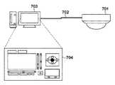 以下に、本発明の好ましい実施の形態を、添付の図面に基づいて詳細に説明する。図7は本発明の実施形態に係る監視カメラとクライアント703(情報処理装置)とにより構成される撮像システムを示す図である。監視カメラ701はネットワーク702によってクライアント703(情報処理装置)と接続されている。クライアント703(情報処理装置)上のアプリケーション704は監視カメラ701を遠隔から操作し、監視カメラ701で撮影した映像を表示し、レンズ制御を行いユーザーの所望の映像設定により監視カメラ701を制御できる。監視カメラ701はアプリケーション704のユーザーインターフェース(UI)を変更することが可能である。監視カメラ701の持つ機能によりユーザーインターフェース(UI)の制御ボタンの増減やパン、チルト、ズームなどのモーター制御を行うためのスライダーバーなどの表示を変更する表示制御が可能である。なお、アプリケーション704は所望の監視カメラ701に対して配信要求を行うことにより、映像や監視カメラ内の各種情報を取得することができ、アプリケーション704内の所定位置に表示することが可能である。  Hereinafter, preferred embodiments of the present invention will be described in detail with reference to the accompanying drawings. FIG. 7 is a diagram showing an imaging system including a monitoring camera and a client 703 (information processing apparatus) according to the embodiment of the present invention. The