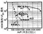 本発明のABC戦略の利点は、図8で示されるように、本発明のABCファイバの性能妥協点をいくつかの従来技術の設計と比較することによってより良く理解することができる。曲げ損失とHOM抑制と有効モード面積との間の三項目妥協点は、すべてのファイバ設計をRb=15cmで0.1dB/mの計算曲げ損失に固定し、Aeffに対する相対的HOM抑制(すなわち、HOM損失/基本モード損失)をグラフ化することによって、図に要約されている。従来技術のステップ屈折率コア・ファイバ(曲線8.6)、および従来技術の放物線状屈折率コア・ファイバ(曲線8.5)は、これらに2自由度しかないので単純な曲線になる(対比は、0.1dB/m曲げ損失要件によってコア領域サイズごとにロック/固定されている)。これらの曲線により、従来技術のステップ屈折率コア設計は、HOM抑制との妥協点の故に、典型的な巻付け要件に対して1000μm2を大幅に越えては拡大できないことが確認される。従来技術の放物線状コア屈折率ファイバは、大幅に改善された妥協点を示すが、HOMの大幅な曲げ損失抑制が必要な場合には依然として面積が制限される。The advantages of the ABC strategy of the present invention can be better understood by comparing the performance compromises of the ABC fiber of the present invention with several prior art designs, as shown in FIG. The three-way compromise between bend loss, HOM suppression and effective mode area is that all fiber designs are fixed at a calculated bend loss of 0.1 dB / m at Rb = 15 cm and relative HOM suppression relative to Aeff ( That is, it is summarized in the figure by graphing HOM loss / fundamental mode loss). The prior art step index core fiber (curve 8.6) and the prior art parabolic index core fiber (curve 8.5) are simple curves since they have only two degrees of freedom (contrast). Is locked / fixed for each core region size by 0.1 dB / m bending loss requirement). These curves confirm that prior art step index core designs cannot scale well beyond 1000 μm2 for typical winding requirements due to a compromise with HOM suppression. Prior art parabolic core index fibers show a much improved compromise, but still have limited area when significant bending loss suppression of the HOM is required.