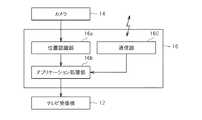 図1は、本発明の実施形態に係るゲームシステムの利用シーンを示す図である。同図に示すようにゲームシステム10は、家庭用のテレビ受像機12に接続されたゲーム機本体16、ゲーム機本体16に接続されたカメラ14、プレイヤPが手に持つ操作デバイス18を含んでいる。ゲーム機本体16は、公知のコンピュータゲームシステムである。カメラ14は例えばテレビ受像機12の上面に設置され、テレビ受像機12の前方を映し出すようになっている。カメラ14による撮影画像はゲーム機本体16に入力され、そこで各種の情報処理に供される。操作デバイス18の先端には特定の色で発光する発光体20が取り付けられており、プレイヤPが操作デバイス18を手にして、カメラ14の前方でそれを動かすと、カメラ14による撮影画像における発光体20の位置を認識するとともに、発光体20が映し出された領域の広さに従って、カメラ14と発光体20との距離を認識する。そして、これらの情報に従って、ゲームなどのアプリケーションの処理を制御するようになっている。  FIG. 1 is a diagram showing a usage scene of the game system according to the embodiment of the present invention. As shown in the figure, the