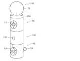 次に、他の実施形態に係る操作デバイスについて説明する。図17は当該他の実施形態に係る操作デバイスの外観斜視図であり、図18は、発光モジュールを正面方向から示す斜視図、図19は、本体モジュールを正面方向から示す斜視図、図20は、第1の追加操作モジュールを正面方向から示す斜視図、図21は、第2の追加操作モジュールを正面方向から示す斜視図である。図17に示される操作デバイスは、発光モジュール140、本体モジュール80、第1の追加操作モジュール90、第2の追加操作モジュール100をこの順に、各モジュールの正面をそろえて直列に接続したものである。図18に示すように、発光モジュール140は背の低い円柱状の本体の上面に発光体20が取り付けられており、下面中央には接続コネクタ(雌コネクタ)142が設けられている。図19に示すように、本体モジュール80の本体は、発光モジュール140の本体と同径の円柱状をなしており、正面には方向情報を入力するための操作部材83が配置されている。また、本体上面中央には接続コネクタ(雄コネクタ)81が設けられ、下面中央には接続コネクタ(雌コネクタ)82が設けられている。図20に示すように、第1の追加操作モジュール90の本体は、本体モジュール80の本体と同径の円柱状をなしており、正面には複数のボタンからなる操作部材83が配置されている。さらに、背面には傾倒させることにより該傾倒方向に対応した信号をゲーム機本体16に送信するためのスティック状の操作部材94が配置されている。また、本体上面中央には接続コネクタ(雄コネクタ)91が設けられ、下面中央には接続コネクタ(雌コネクタ)92が設けられている。さらに、図21に示すように、第2の追加操作モジュール100の本体は、本体モジュール80の本体と同径の円柱状をなしており、正面には単一のボタンからなる操作部材103が配置されている。また、本体上面中央には接続コネクタ(雄コネクタ)101が設けられ、下面中央には接続コネクタ(雌コネクタ)102が設けられている。  Next, an operation device according to another embodiment will be described. 17 is an external perspective view of an operation device according to another embodiment, FIG. 18 is a perspective view showing the light emitting module from the front direction, FIG. 19 is a perspective view showing the main body module from the front direction, and FIG. FIG. 21 is a perspective view showing the first additional operation module from the front direction, and FIG. 21 is a perspective view showing the second additional operation module from the front direction. In the operation device shown in FIG. 17, the