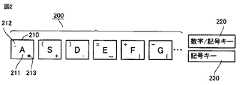 このような構成によれば、ユーザーは、一度、画面の端部にあるキーボード切り替えキー(たとえば、キー220またはキー230)を操作する必要がある。そのため、操作時の目線の移動あるいは指の移動距離が長くなる場合がある。また、たとえば、キーボードの文字入力モードが3種類ある場合には、3つの文字または記号が表示されることになるため、ユーザーにとっては、どの文字タイプキーを選択すると所望の文字入力が可能になるか分かりにくいという問題も生じ得る。したがって、文字または記号の入力操作が容易になる技術が必要とされている。 According to such a configuration, the user needs to operate a keyboard switching key (for example, key 220 or key 230) at the edge of the screen once. For this reason, the movement of the line of sight or the movement distance of the finger may become longer during operation. For example, when there are three types of character input modes of the keyboard, three characters or symbols are displayed, so that the user can input a desired character by selecting which character type key. It can be difficult to understand. Therefore, there is a need for a technique that facilitates the input operation of characters or symbols.