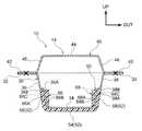 また、図6に示されるように、平面視で、係合部66が一体に形成された部位における内壁56の内面(係合部66とは表裏反対側の面)には、略円錐形状(平断面視で略「V」字状)に凹む窪み部66Cが形成されている。この窪み部66Cが形成される構成とすることにより、後述するように、係合部66において樹脂材内の繊維が絡み合うようになっている。  In addition, as shown in FIG. 6, the inner surface of the inner wall 56 (surface opposite to the engagement portion 66) at the portion where the