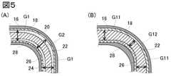 図5(A)によれば、非折り曲げ部分における信号線路導体18からグランド層26までの距離は“G1”と定義され、折り曲げ部分における信号線路導体18からグランド層26までの距離を“G2”と定義される。また、図5(B)によれば、非折り曲げ部分における信号線路導体18からグランド層26までの距離は“G11”と定義され、折り曲げ部分における信号線路導体18からグランド層26までの距離を“G12”と定義される。これを踏まえて、図5(A)に示す距離G1およびG2の差分は、図5(B)に示す距離G11およびG12の差分よりも小さい。 According to FIG. 5A, the distance from the