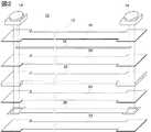 フラットケーブル10を分解した状態を示す図2を参照して、伝送線路12は、レジスト層28,グランド層26,補強層24,絶縁層22,補強層20,信号線路導体18,およびレジスト層16をこの順で積層しかつ熱圧着することで作製される。ここで、レジスト層16,28,補強層20,24,絶縁層22の主面の形状ないし寸法は互いに一致する。 Referring to FIG. 2 showing the state where