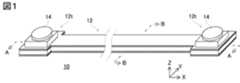 伝送線路12の長さはX軸に沿って延び、伝送線路12の幅はY軸に沿って延び、伝送線路12の厚みはZ軸に沿って延びる。長さは任意に調整され、幅は長さ方向両端を除いて均一の大きさに調整され、厚みは全長にわたって均一の大きさに調整される。長さ方向両端における幅は、他の部分の幅よりも大きくかつ均一の値に調整される。したがって、Y軸方向を上下方向に合わせた状態で伝送線路12をZ軸方向から眺めたとき、伝送線路12は略H形をなす。伝送線路12の両端において幅が拡大した部分を“線路端部12t”と定義すると、コネクタ14は線路端部12tの主面に設けられる。 The length of the