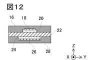 なお、図1〜図4に示すフラットケーブル10では、補強層20および24の主面の形状ないし寸法を絶縁層22の主面の形状ないし寸法と一致させるようにしている。しかし、図11に示すように、補強層20の形状ないし寸法を信号線路導体18の形状ないし寸法とほぼ一致させ、補強層24の形状ないし寸法をグランド層26の形状ないし寸法とほぼ一致させるようにしてもよい。この場合、伝送線路12のX軸方向中央をY軸沿って切断したときの断面は図12に示す積層状態をなす。 In the