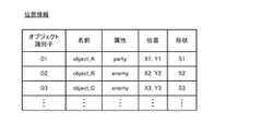「オブジェクト識別子」は、オブジェクト表示領域120に表示されているオブジェクトの識別子である。「名前」は、オブジェクトの名前を示す情報である。「属性」は、オブジェクトの属性を示す情報である。例えば、「party」は、オブジェクトが味方のパーティであることを示す情報である。また例えば、「enemy」は、オブジェクトが敵であることを示す情報である。なお、属性に設定される情報は、オブジェクトの所属(味方/敵)に限られず、オブジェクトの属性を示す任意の情報とすることができる。例えば、属性として、オブジェクトの能力に関する情報が設定されてもよい。「位置」は、オブジェクトの表示位置を示す情報である。「位置」は、例えば、オブジェクトの重心位置とすることができる。また、「位置」は、例えば、オブジェクト表示領域120の左上(原点)からの相対座標により表すことができる。「形状」は、オブジェクトの形状を示す情報である。「形状」は、例えば、オブジェクトの画像を示す情報であってもよいし、ポリゴンの集合を示す情報であってもよい。  The “object identifier” is an identifier of the object displayed in the