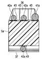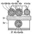 同軸線である複数の信号線42は、芯線42aがインピーダンスをコントロールする樹脂製の誘電体42b内に挿通しており、この誘電体42bの外周を覆う、例えば細い導体が編組されて、GNDとして利用される上述の外部導体42cが絶縁樹脂から形成された外皮42dに被覆された構成となっている。  A plurality of
