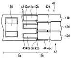 このとき、複数の信号線42は、図5に示したように、誘電体42bの先端位置が芯線接続部5aに重ならないように芯線接続部5aの基端に近接した位置となるように剥ぎ取られて芯線42aが剥き出された状態となっている。これにより信号線42は積層基板5aに対して平行に接続できるため、信号線42が紙面の上下方向に曲がって撮像ユニットの外形が大きくなることを防ぐことができる。  At this time, as shown in FIG. 5, the plurality of