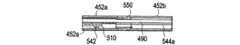 発射制御ワイヤ490は、細長いシャフト452を通って、及びワイヤコネクタ542の中に形成された穴を通って延び、かつナット550の中のネジ穴にネジ式に嵌合される。発射制御ワイヤ490の遠位端は、リテーナ押しスリーブ556の中に据え付けられたリテーナ押し部554の中に延在し、これらは共に図14Eに示されており、また米国特許公開公報第2005/0277954号により詳細に記載されている。広くは、発射ノブ430の回転は、発射制御ワイヤ490を回転させるのに有効である。発射制御ワイヤ490は、細長いシャフト452の近位部分と遠位部分との間に固定されたナット550にネジ式に嵌合されるので、ナット550のネジ穴は、発射制御ワイヤ490を細長いシャフト452を通って遠位側に移動させて、リテーナ押し部554を遠位方向に前進させる。リテーナ押し部554は、細長いシャフト452の遠位部分の中のガレージ532内に格納されたかえし付き螺旋形リテーナ500の近位に位置付けられるため、押し部554の遠位運動は、シャフト452を通してリテーナ550を前進させ、かえし付き管状リテーナ500をエンドエフェクタ520のジョー524a及び524bの中に位置付ける。細長いシャフトを通して複数のリテーナを前進させ、リテーナをジョー内に位置付けるために、様々なその他の技術を用いることができることは、当業者には理解されよう。